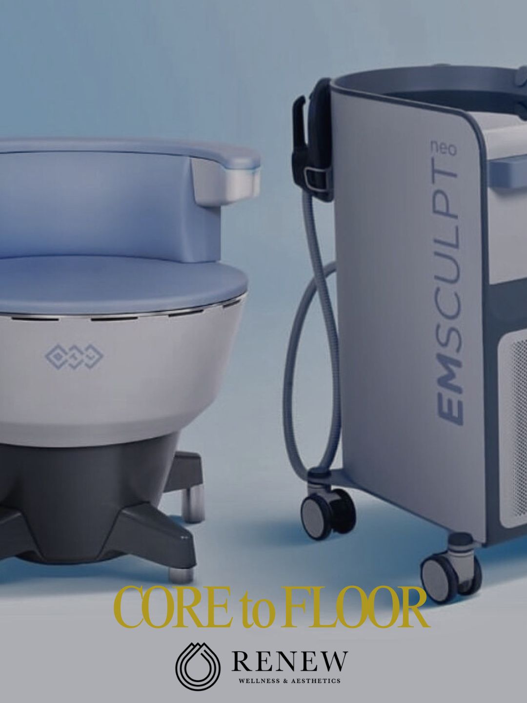 Renew Wellness & Aesthetics offers a unique treatment approach that combines both Emsculpt NEO® and Emsella® to address a patient’s entire core–abs, back, and pelvic floor muscles–in under an hour. Core to Floor therapy utilizes two high-intensity focused electromagnetic field (HIFEM) therapies to strengthen, firm, and tone the abdomen and pelvic floor muscles.